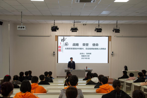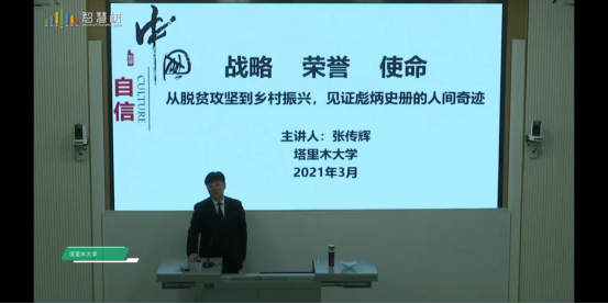 张传辉以“从脱贫攻坚到乡村振兴,见证彪炳史册的人间奇迹”为题,全面生动阐述了我国脱贫攻坚战取得全面胜利的意义、我校荣获“全国脱贫攻坚先进集体”称号的荣光、我校在全面推进南疆乡村振兴中乘势而上的坚定信心决心。张传辉讲到,脱贫攻坚战取得全面胜利绝非一己之力、一人之功,而是在党坚强的领导力、组织力下,广泛动员全党全国各族人民以及社会各方面力量共同向贫困宣战,举国同心,合力攻坚,党政军民学劲往一处使,东西南北中拧成一股绳,才取得的骄人成绩。如果没有党的领导,我们便没了“主心骨”,就无法汇集成干事创业、攻坚克难的强大合力。脱贫攻坚战取得全面胜利,再次充分证明,只要我们坚持党的领导、坚定走中国特色社会主义道路,就一定能够办成更多像脱贫攻坚这样的大事难事,不断从胜利走向新的胜利。