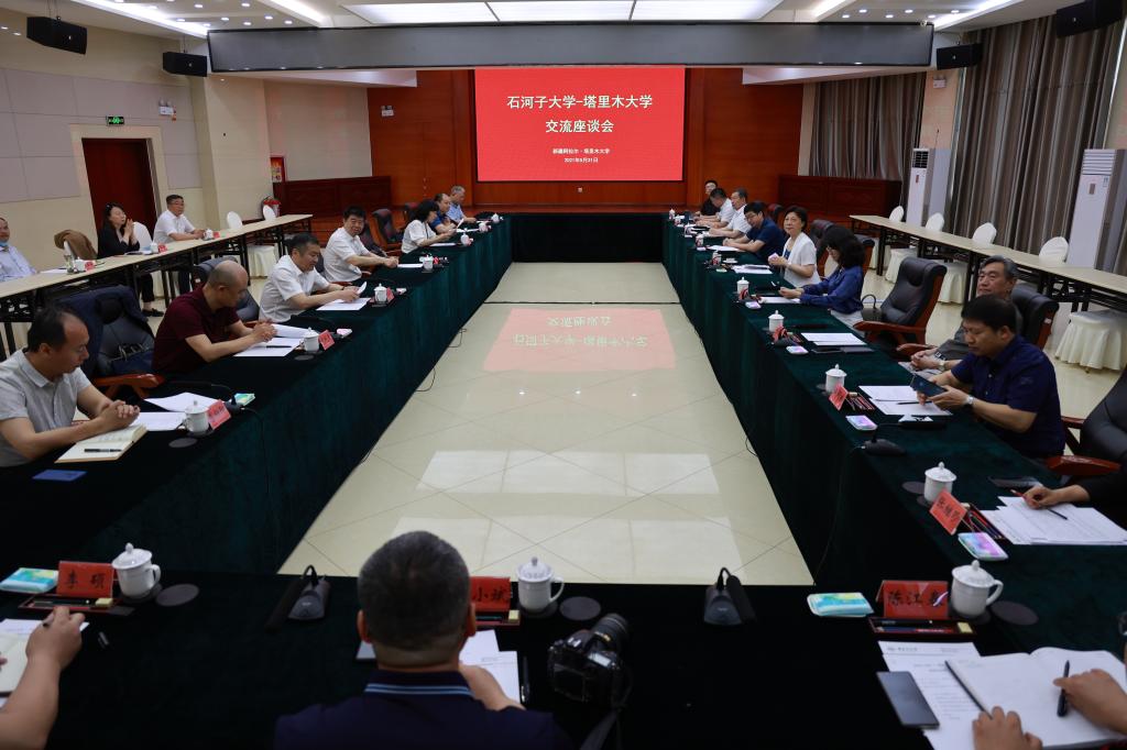 柴真介绍了石河子大学的办学历程、发展成就和目标任务。她指出,石大与塔大作为兵团的两所兄弟高校,全面贯彻党的教育方针,不忘立德树人初心,牢记为党育人为国育才使命,一直秉承着用兵团精神、胡杨精神育人,为维稳戍边服务的办学理念,大力培养爱国爱疆、担当奉献的社会主义建设者和接班人。希望两校今后深入学习贯彻总书记重要指示批示精神和第三次中央新疆工作座谈会精神,牢牢坚持社会主义办学方向,落实立德树人根本任务,发挥各自特色,实现优势互补、互惠双赢、协同发展,携手为服务兵团履行职责使命、发挥特殊作用,实现新疆社会稳定和长治久安总目标,展现兵团高等教育的新使命新担当,展现兵团高等教育的新作为新贡献。