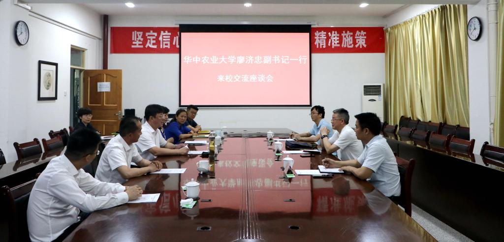 6月5日上午,华中农业大学党委副书记廖济忠一行来校访问。双方召开座谈会,我校党委副书记、校长张传辉,党委副书记张爱萍以及相关部门、学院主要负责同志参加座谈会。座谈会由张爱萍主持,在行政楼317会议室召开。