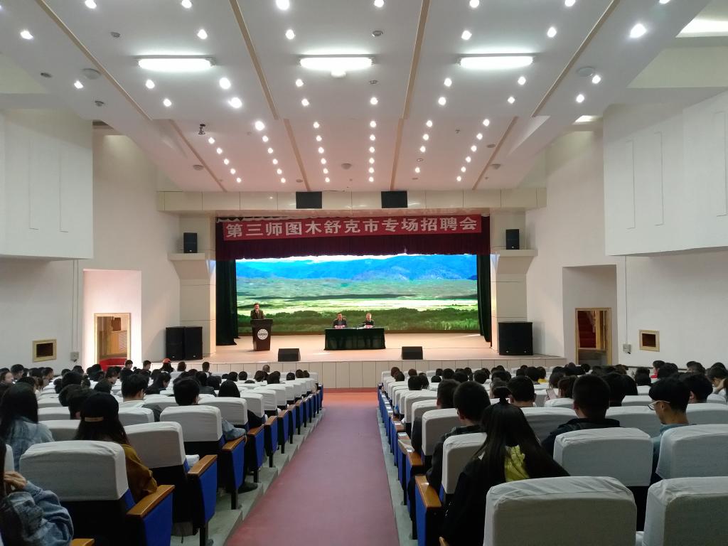 3月13日下午,第三师图木舒克市专场招聘会在我校大学生活动中心举办。第三师图木舒克市教育局局长刘玉成介绍了该师特岗教师招聘事宜及人才引进待遇、薪资和工作环境,通过宣传视频直观展示了第三师图木舒克市的发展前景,对毕业生进行了现场答疑。