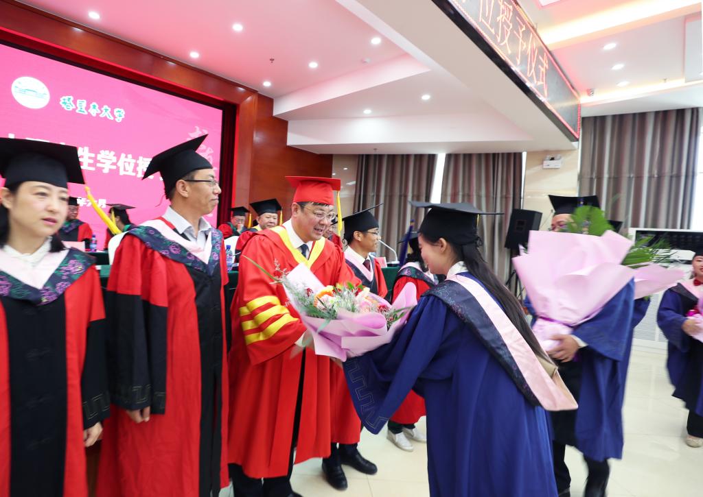 仪式上,党委副书记、校长、校学位评定委员会主席张传辉教授授予学位。同学们依次上台,张传辉为硕士研究生一一拨穗,授予学位,定格那庄严的时刻。握手、拨苏、合影,万里送行舟,道不完求学数载路,远送从此别,说不尽学师生情。这庄严仪式凝聚为毕业生们对塔大印记的浓重一笔,也成为硕士生涯的完满句号。