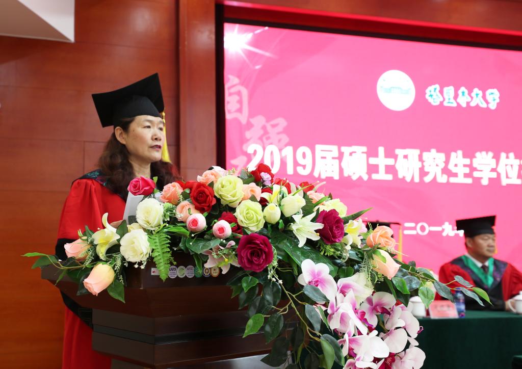 张利莉主持仪式,希望毕业研究生牢记希望和嘱托,要抓住梦的翅膀,乘风破浪、奋然前行,朝着精彩的未来启航。要做一个有远大理想抱负的人,要做一个有深厚家国情怀的人,要做一个有伟大创造力的人,在实现中华民族伟大复兴中国梦的宏伟征程中放飞青春梦想。