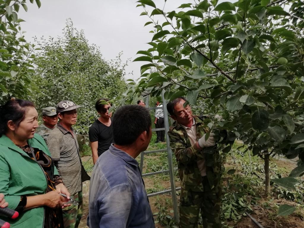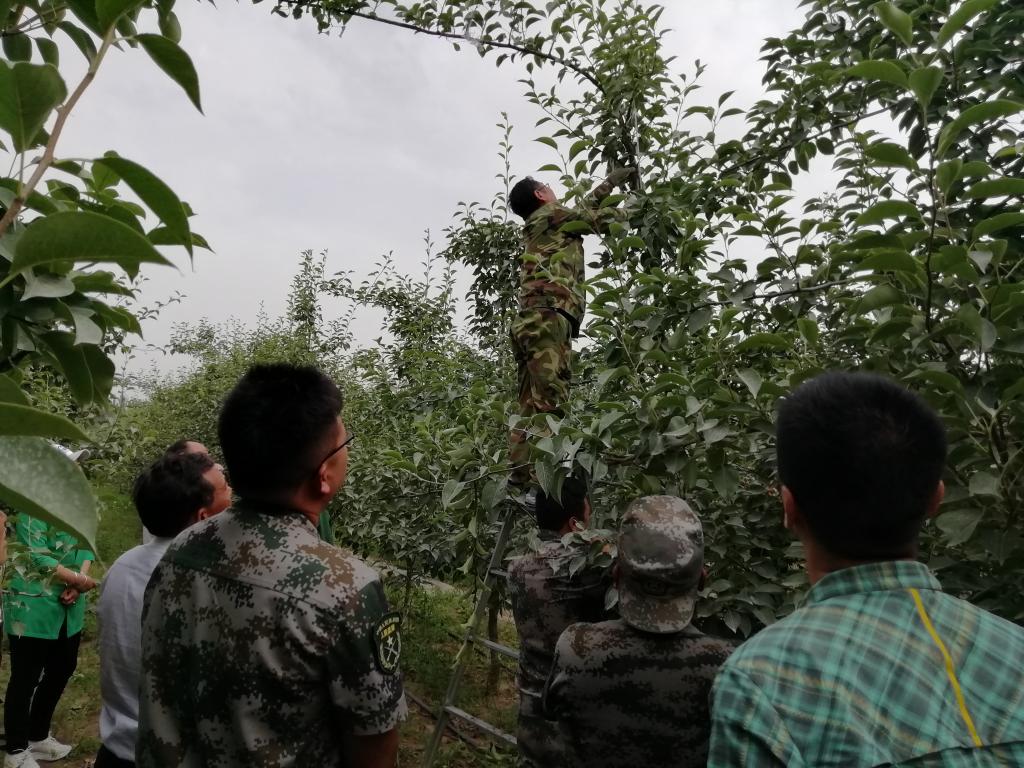 两个小时的现场教学,张教授不仅在树下,还搭梯爬树,亲自为职工示范“打顶”、“扭枝”、“抹芽”等具体操作,是名副其实的“上树教授”。除了讲解,张教授还让职工们上手实践,并及时纠正,让职工们真正掌握技术,学会田管本领。除此之外,张教授还指导了已完成修剪和田管的职工梨树地,将下一步要注意的重点工作向他们一一叮嘱。
