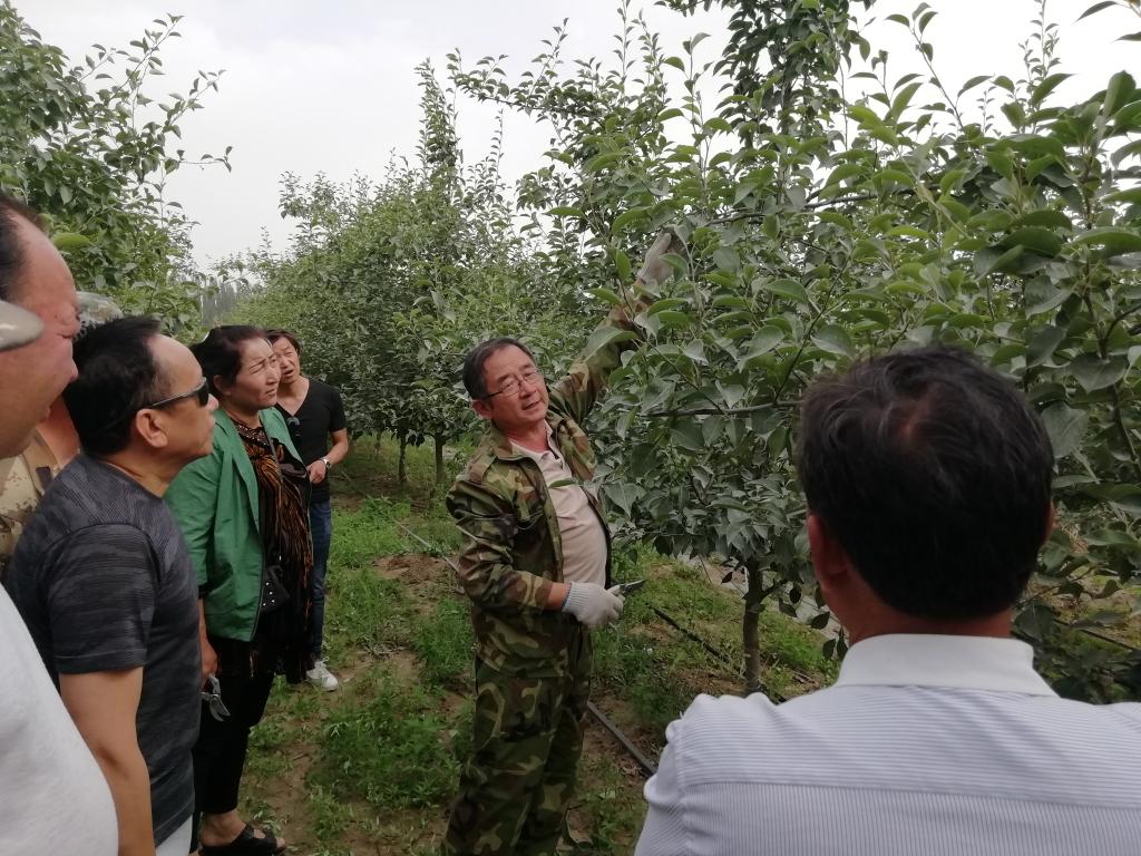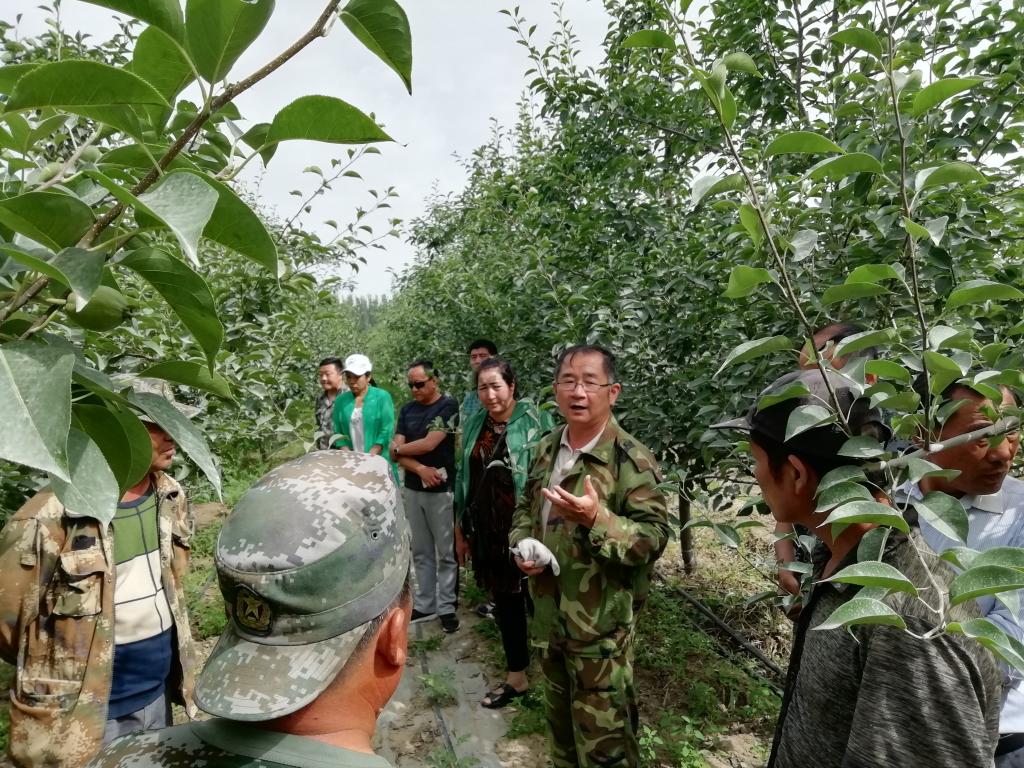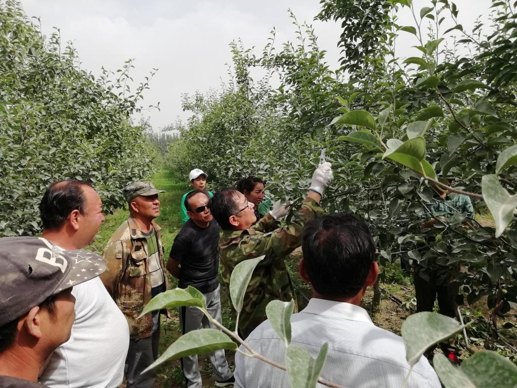 张教授查看了试验田长势,待职工都聚集完毕,他开始向职工们现场教学。“科学进行田间管理,将会对当年和次年的座果率起到非常大的作用!”教授一边讲解,一边为身边的职工群众做示范,从透光率、通风率,到消除顶端优势,让营养富集果实,他尽量将专业术语转化成老百姓通俗易懂的实用技术,还时不时回答着职工提出的顾虑问题。围绕提质增效、养树护林等不仅让职工群众了解如何使果树多结果子,更用发展的眼光教会大家要可持续种植,会养会管,这样才能持续增收致富。