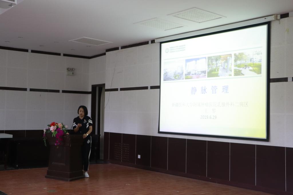 上午,新疆医科大学附属肿瘤医院超声科副主任李平新,围绕病理基础、影像学诊断、超声分类等内容作了《乳腺原位癌的超声特征》讲座;乳腺外科二病区许文婷主治医师,以一个乳腺癌患者和医生共同与乳腺肿瘤斗争的故事为例,作了《山重水复疑无路,柳暗花明又一村》讲座,讲述了体格检查,影像学检查B超、钼靶、CT,病理诊断,初步诊断,治疗经过及评估,手术治疗,术后常规病理,术后病理诊断等内容;乳腺外科二病区王黎护士长,围绕PICC专科管理概况、静脉输液治疗范畴、静脉特点、静脉操作流程、静脉炎分级、护理干预措施等内容作了《静脉管理》讲座。三位医护专家结合自身的专业知识和多年的临床经验,与同行分享了自己的专业知识,同时,现场与第一师阿拉尔市人民医院、校医院的医护人员进行互动,对提出的问题一一作了解答,大家相互交流学习,共同提高业务水平。