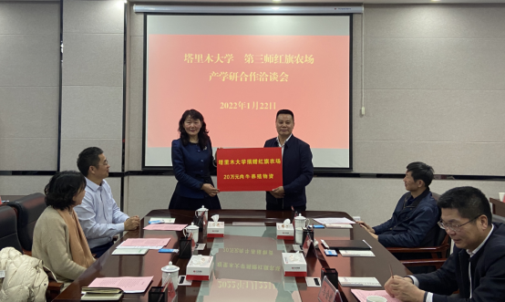 张利莉代表学校向红旗农场捐赠20万元肉牛养殖物资。