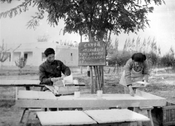 建校初期,田野当课堂,师生们在胡杨树下上课。