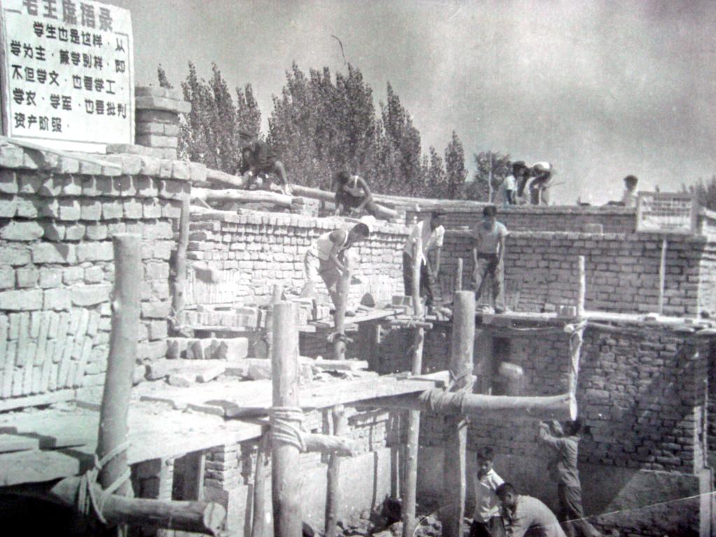 建大学难,在世界第二大沙漠建大学难上加难!建校之初,学校仅有6个地窝子、5间土平房和新开垦的500亩耕地,自然条件极端恶劣,物质条件极度匮乏。19名教师和500多名来自部队的学生发扬南泥湾精神和“抗大”作风,凭着一双手和扁担、筐子、坎土曼,在万古荒原上开荒造田,伐木脱坯,边学习边劳动建校。没有校舍自己盖,没有粮食自己种,没有教具自己做;住的是地窝子,睡的是红柳床,黑板挂在树干上,讲义放在膝头上。虽然条件艰苦,但师生们的内心却富足快乐。