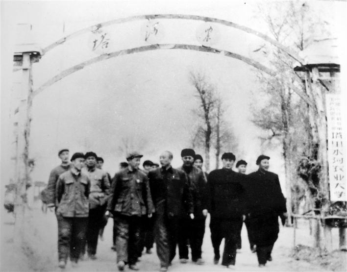 王震将军(前排左三)在塔里木河农业大学(现塔里木大学)视察工作。