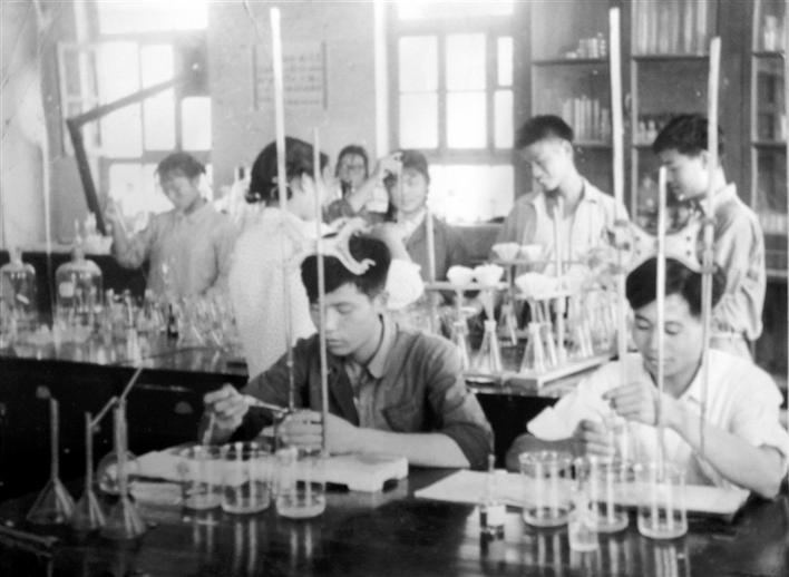 学生们在进行化学实验。