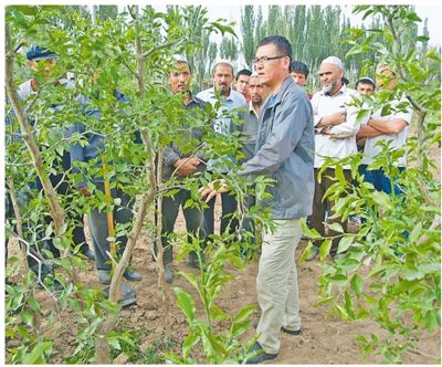 “我刚去224团搞种植的时候,当地人都说这里种树不活,种草不生,种地不长。我们到地里示范修剪技术,在枣树整形中将枣头短剪,很多农户也都反对。不过后来,看到剪掉枣头的红枣产量比别的高,农民们就开始信了。”王新建说:“科技是脱贫的金钥匙,我们的任务就是把听得懂、用得上的技术传授给农民。”