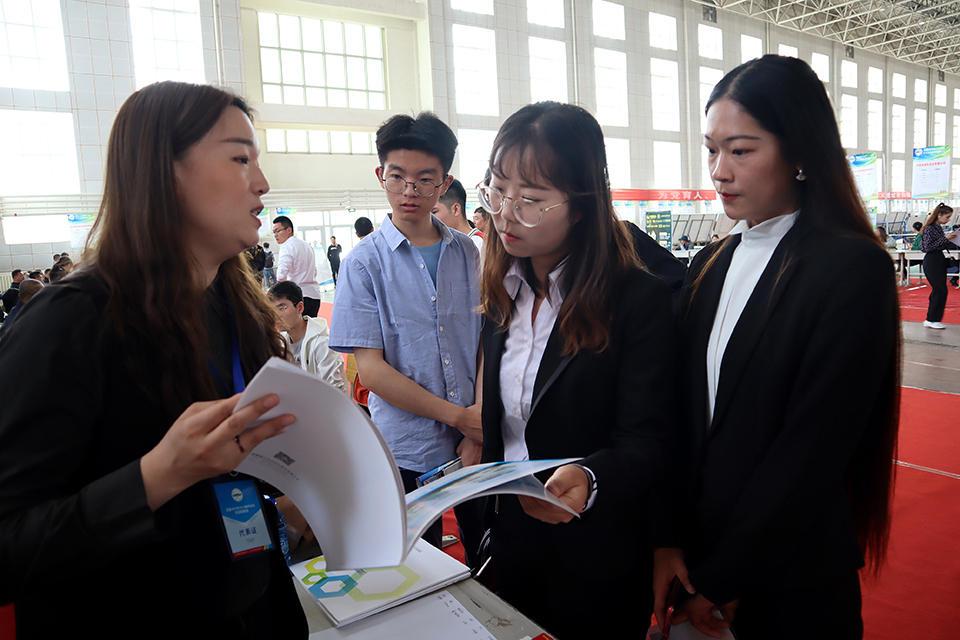 毕业生向用人单位了解情况。