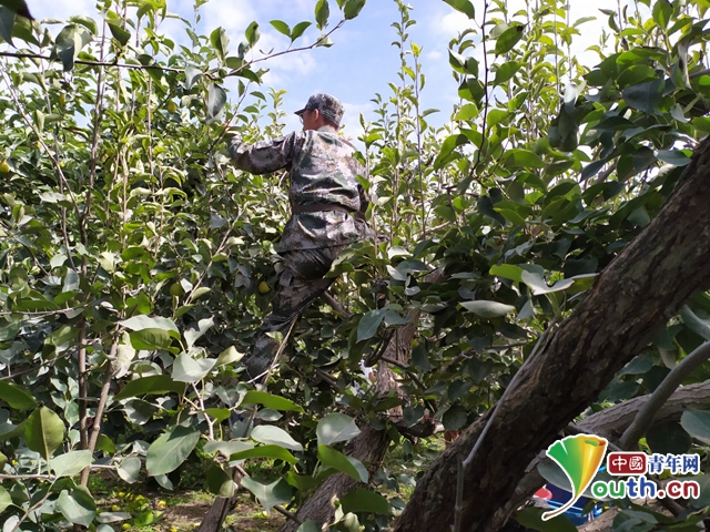 上树采摘香梨。中国青年网通讯员 杜京京 供图