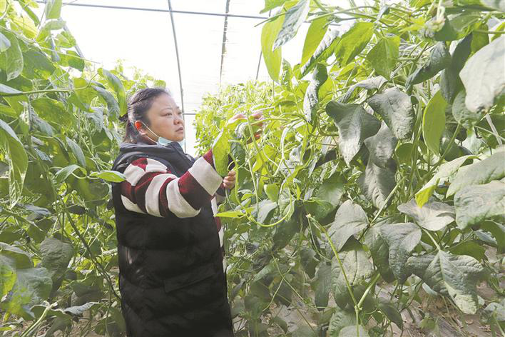 11月20日,民航新村村民王春枝在蔬菜大棚里察看蔬菜长势。 兵团日报驻十四师记者站 刘秋月 摄