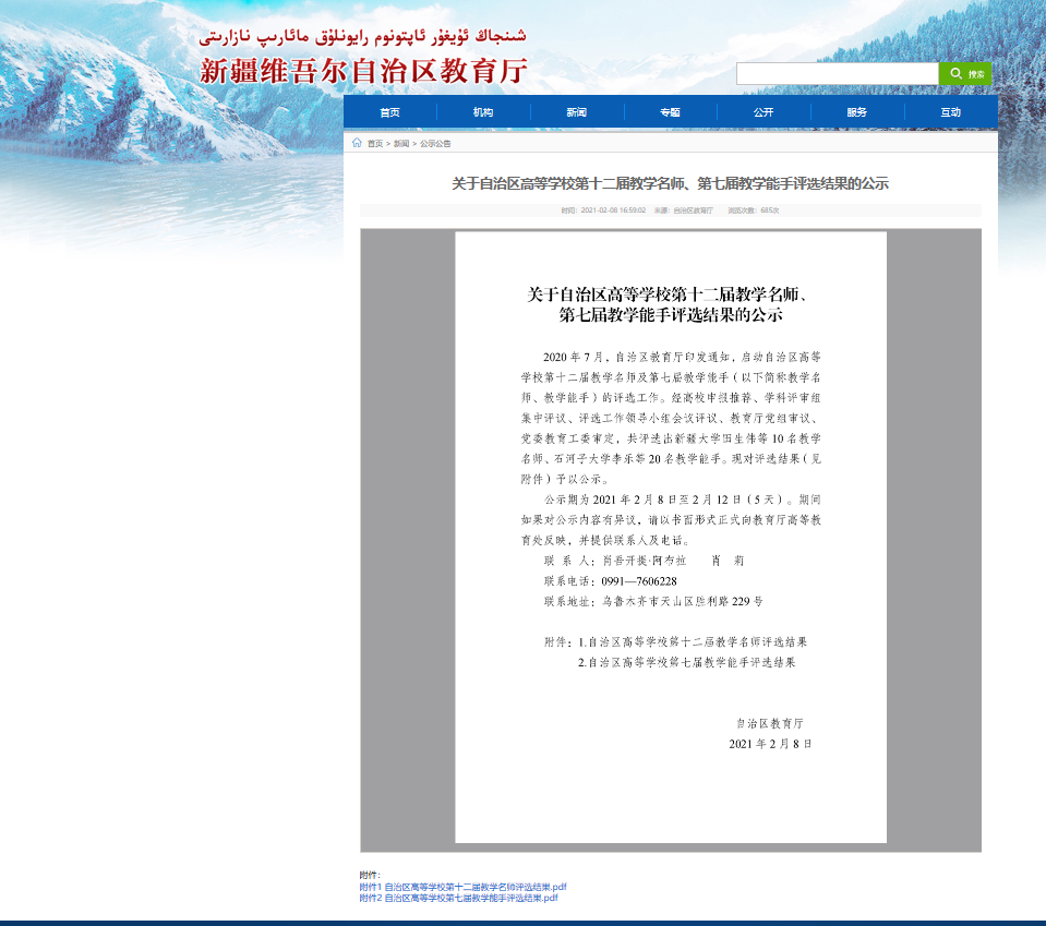 【新疆维吾尔自治区教育厅】关于自治区高等学校第十二届教学名师、第七届教学能手评选结果的公示