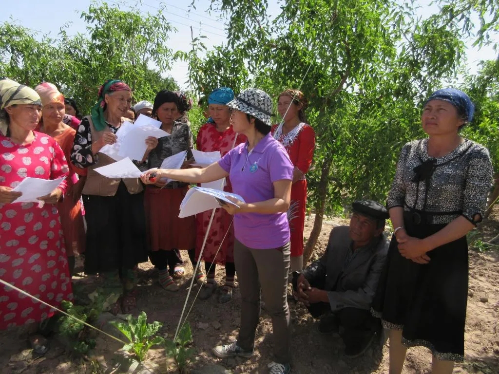 吴翠云教授(右三)为阿瓦提县英艾日克乡托万克栏杆村种植户发放果树种植与管理技术双语培训。(杨宝仁 摄于2016年5月9日)
