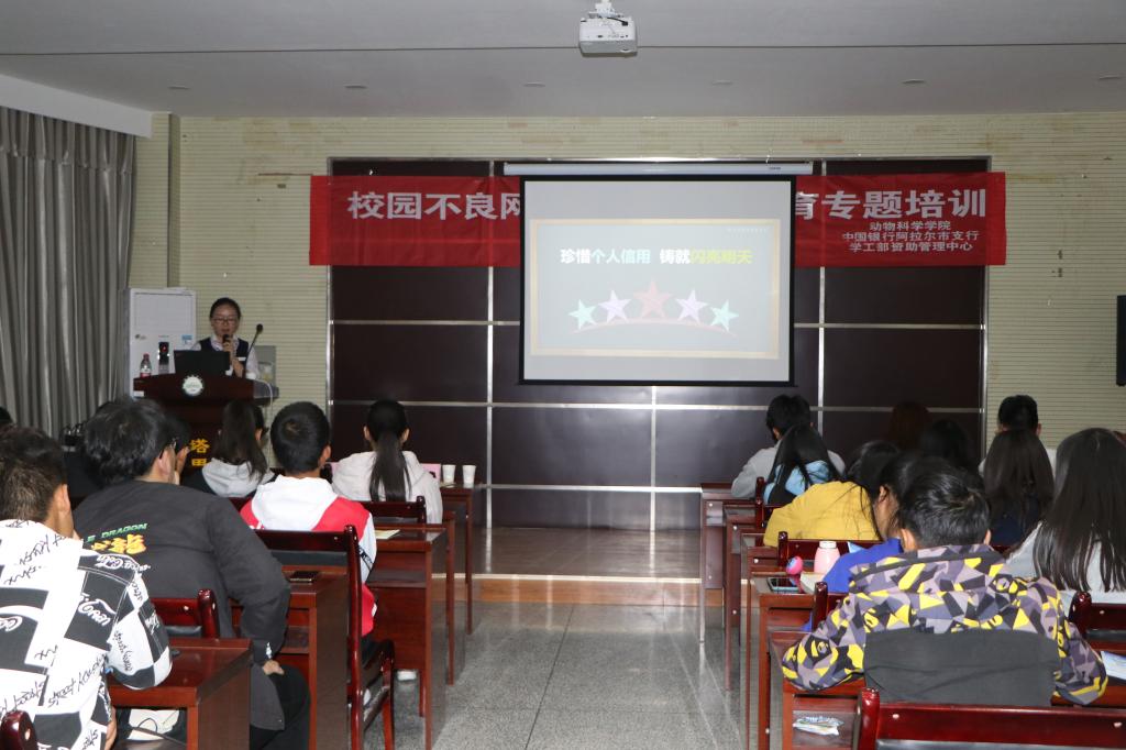10月25日下午,动科院举办了校园不良网贷风险警示教育专题培训,中国银行阿拉尔支行客户经理尚静,工作人员牟宁为学生培训,全院各班团支书、学习委员、生活委员参加。培训会在动科楼218召开。
