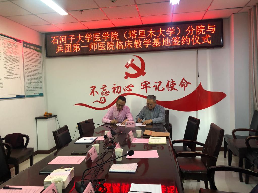 谢建新、陈军为兼职教师代表颁发了高校教师资格证。双方院领导签订了《石河子大学医学院(塔里木大学)分院与第一师医院关于建立临床教学基地协议书》。陈军说,第一师医院会在今后的临床教学工作中高度重视并大力提供临床教学保障,为南疆培养输送更多更优秀的医学人才,为南疆医疗卫生事业发展做出新的更大贡献。