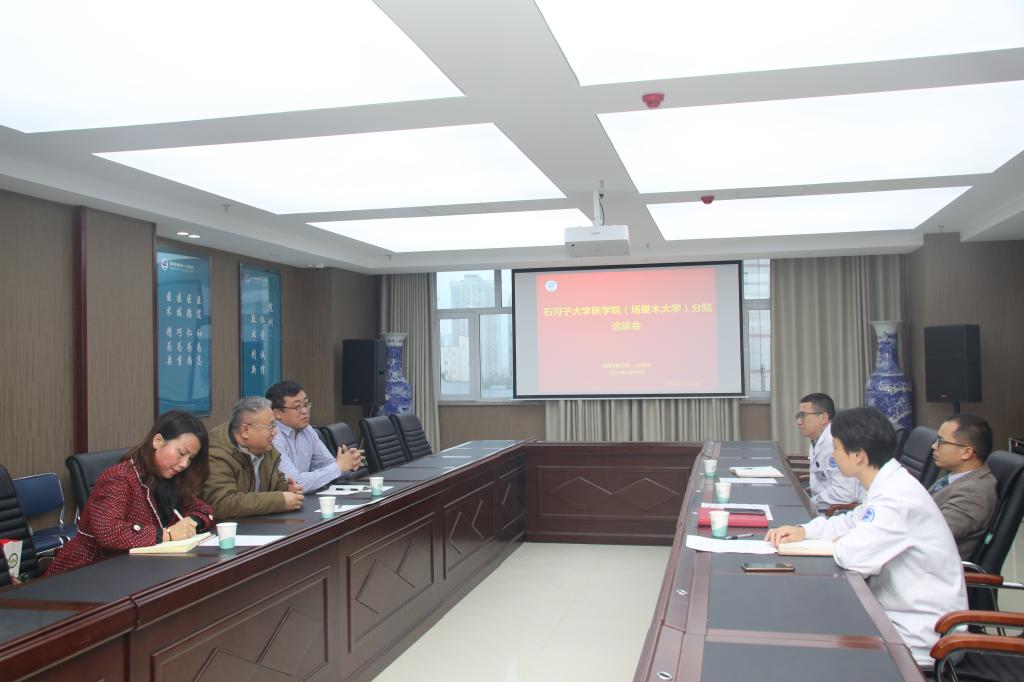 上午,石河子大学医学院(塔里木大学)分院与阿克苏地区第一人民医院召开座谈会,介绍了有关情况,重点就临床教学工作方面合作展开深入交流。