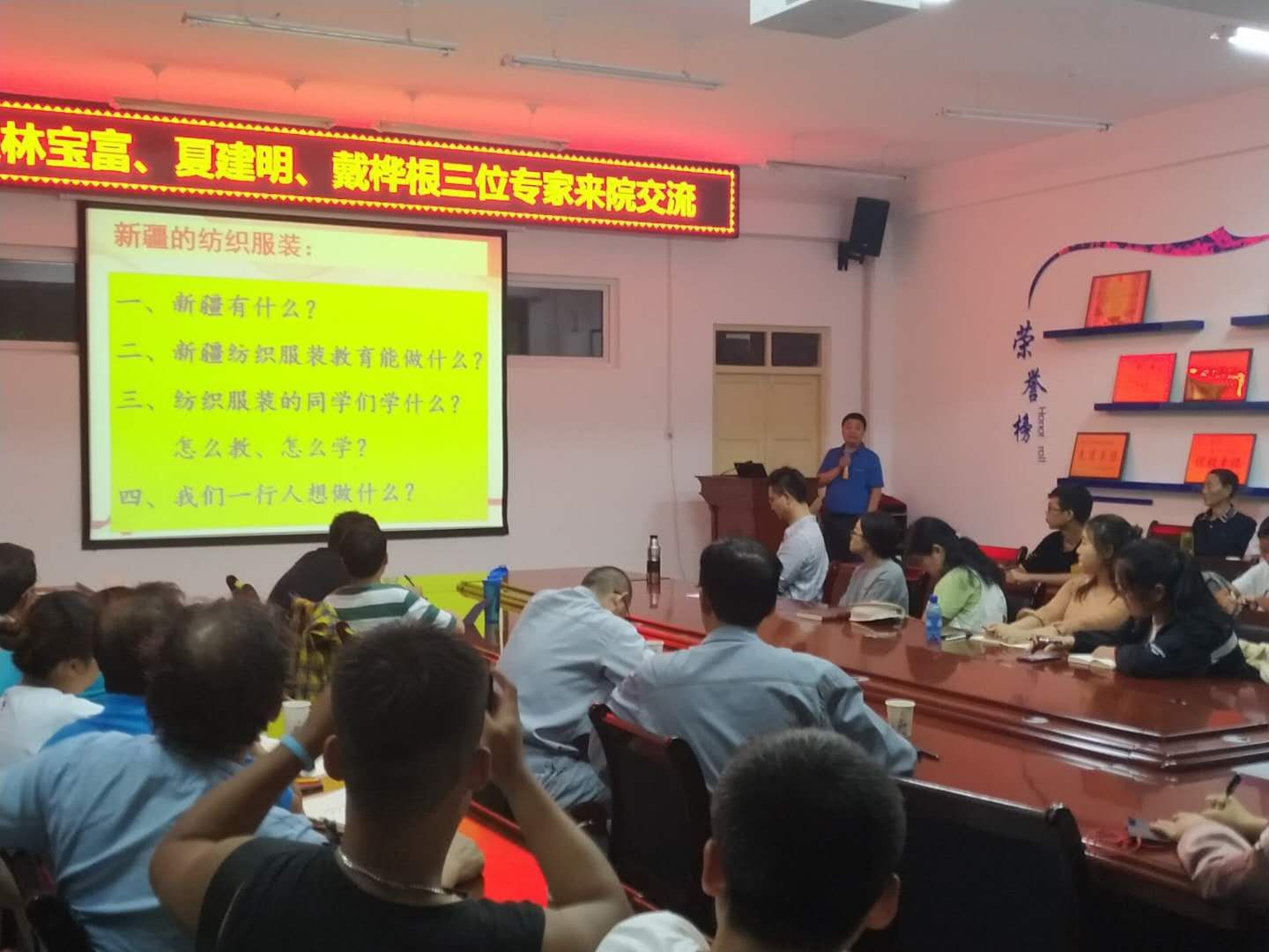 为服务“一带一路”倡议,助力南疆纺织服装产业发展,加强纺织工程专业建设,培育应用型人才,8月30日,东华大学林宝富高级工程师,浙江纺织服装职业技术学院夏建明教授,浙江嘉兴纺织服装学院戴华根副教授三位纺织行业专家一行来校学术交流并做专题报告,机电院副院长王旭峰,纺织工程专业师生,人文院服装设计专业教师,植科院相关专业教师,以及师市纺织企业代表听取报告。报告会由教务处副处长龚䶮主持,在工科楼229举行。