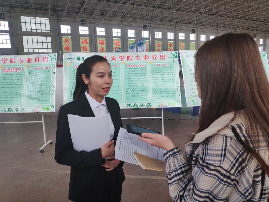 财务管理专业大四学生阿热孜始丽·吐拉麦提,希望可以找到一份与所学专业有关的就业岗位,她更看中公司财务方面的工作岗位。“先就业,再择业”,阿热孜始丽·吐拉麦提说,为了抓住这次招聘机会,她提前筛选了一些感兴趣的公司,很多公司采取网上投递简历的招聘方式,然后再来到现场面试招聘。阿热孜始丽·吐拉麦提说,校园招聘会上,公司数量和就业岗位越来越多,自己的选择也更多,就业方便了许多,这对毕业生来说是非常有利的。她希望自己可以留在南疆、服务南疆、贡献南疆。
