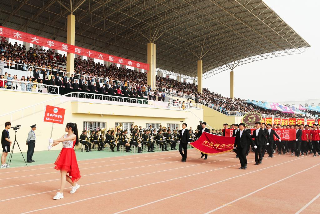 现在向我们走来的是生命科学学院代表队。看!他们整齐的队伍,铿锵的步伐,似乎每一步都充满了必胜的力量!他们坚信,是雄鹰,就该搏击长空;是蛟龙,必能畅游四海。听!他们勇往直前,激情飞扬!他们生生不息,呼声嘹亮!他们将把拼搏的汗水挥洒在赛场!他们将用灿烂的笑容拥抱胜利的辉煌!