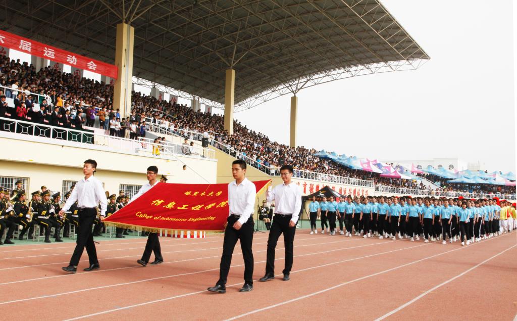 放飞理想、放飞激情、勇往直前!信息工程学院400名健儿正踏着青春的节拍,激情豪迈地走来;这,是一个团结奋发、充满朝气的集体,风雨中,他们勇往直前;阳光下,他们放声高歌。困难遏制不住他们迈向成功的脚步,自信正洋溢在他们青春的笑脸上。