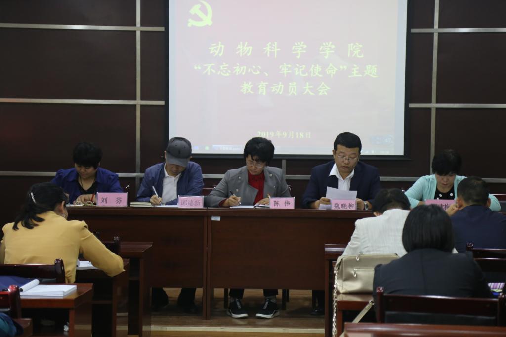 为确保主题教育活动扎实推进,出成果、见成效,按照学校主题教育领导小组要求,9月18日下午,动物科学学院组织召开“不忘初心牢记使命”主题教育动员大会。学校主题教育领导小组办公室第一指导组组长张理到会指导。学院党委副书记、院长陈伟,党委副书记魏晓柳,副院长邱德新,以及全体师生党员参加。会议由魏晓柳主持,在学院218会议室召开。