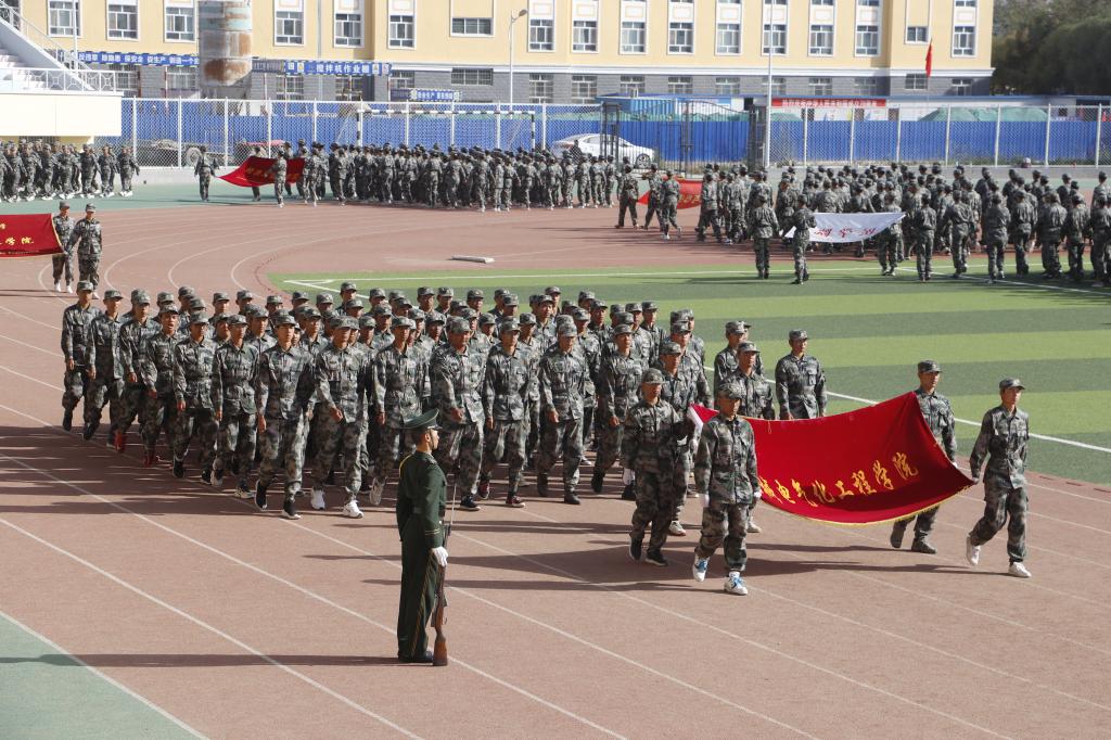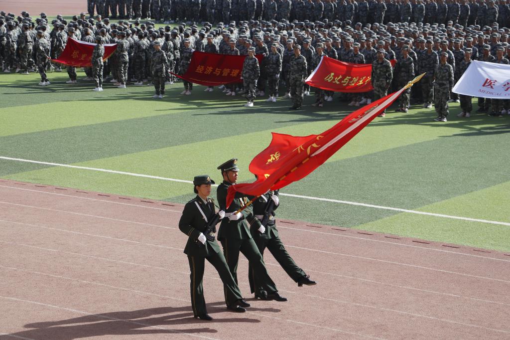伴随着雄壮的《中国人民解放军进行曲》,一支支整齐的方队向主席台走来。军训新生们高喊口号,踢着正步,目光炯炯,精神抖擞,年轻的脸庞洋溢着青春的自信。