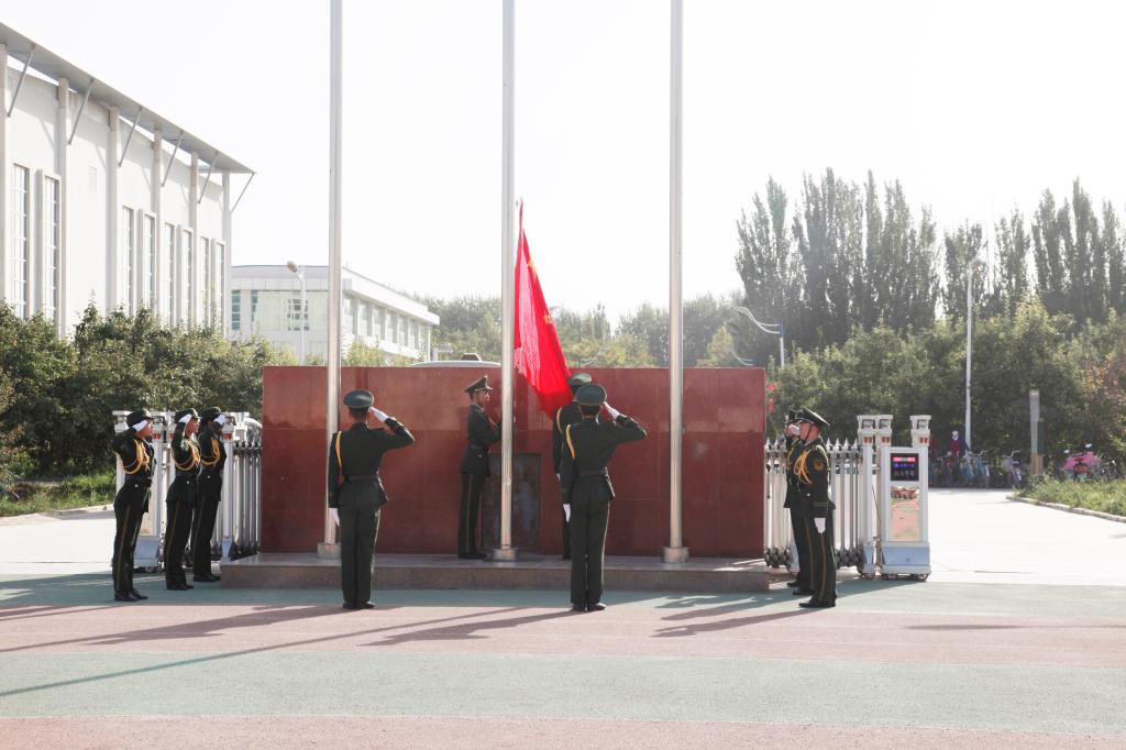 国旗护卫队英姿飒爽,迈着铿锵的步伐,气宇轩昂地护送国旗进场。军乐团奏响雄壮的《义勇军进行曲》,鲜艳的五星红旗冉冉升起,全体师生面向国旗致以崇高的敬意。