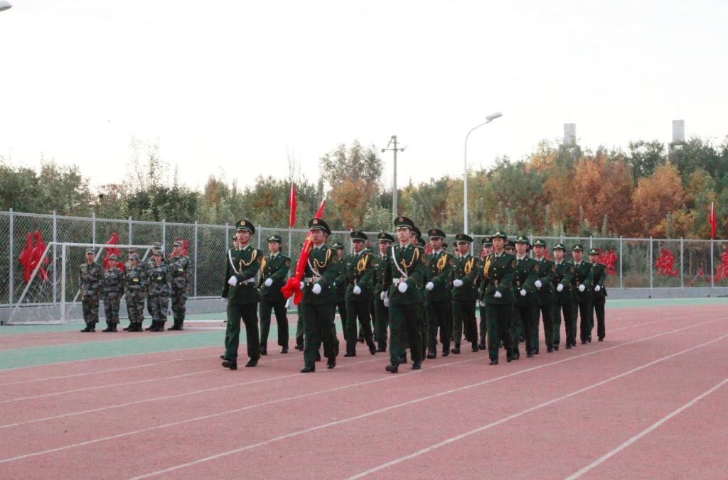国旗护卫队迈着整齐划一的步伐,英姿飒爽的步入运动场,护送国旗,走向升旗台。