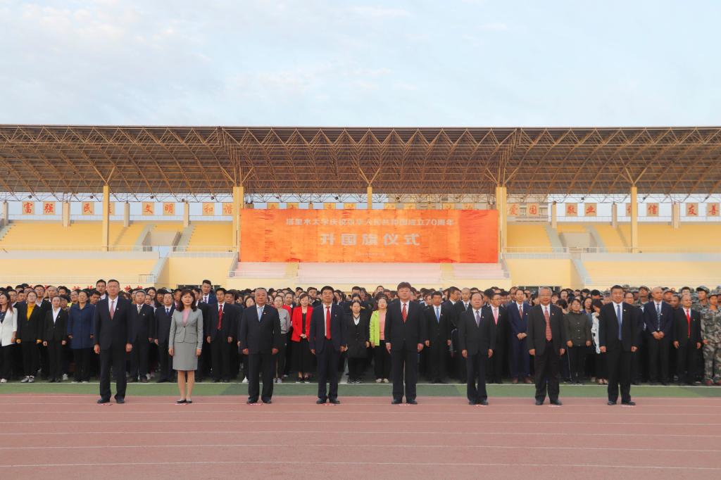党委书记赵光辉,党委副书记、校长张传辉,党委副书记、纪委书记单洪山,党委常委、副校长卢光志,副校长张利莉,党委常委、副校长曲义勇、于军、石长青出席,全体副处级以上领导干部、机关干部和在校师生员工参加。升旗仪式由张传辉主持。