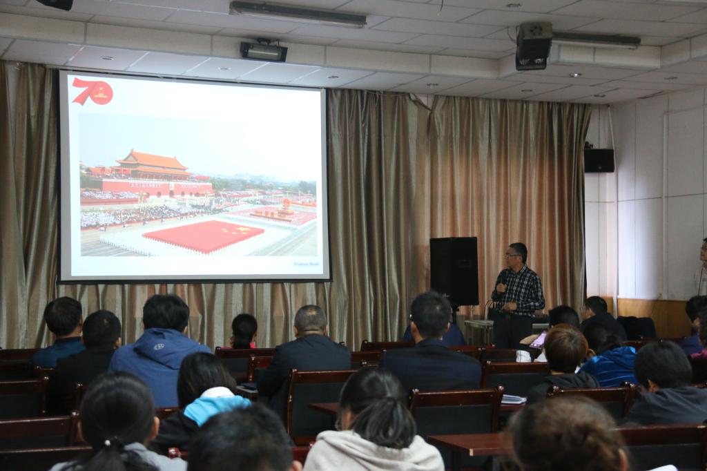 王新建回顾了国庆盛典的盛况,与师生们分享了在现场观礼的感触和感动。“让我印象最深的是大家齐唱国歌的时刻,我能感觉到全身的血液在飞速流淌,热血沸腾。”王新建教授说“无法形容我当时的心情,激动十分,这是我一生中最值得回忆的珍贵时刻。”王新建教授还寄语现场师生,要把握时代脉搏,把个人成长与国家复兴、社会建设结合起来,从小事做起、从事实做起,人生之路才能走得长走得远。他表示,将继续努力工作,服务南疆经济和社会发展,为南疆脱贫攻坚做出更大的贡献,培养更多扎根边疆、献身边疆的社会主义建设者和接班人。