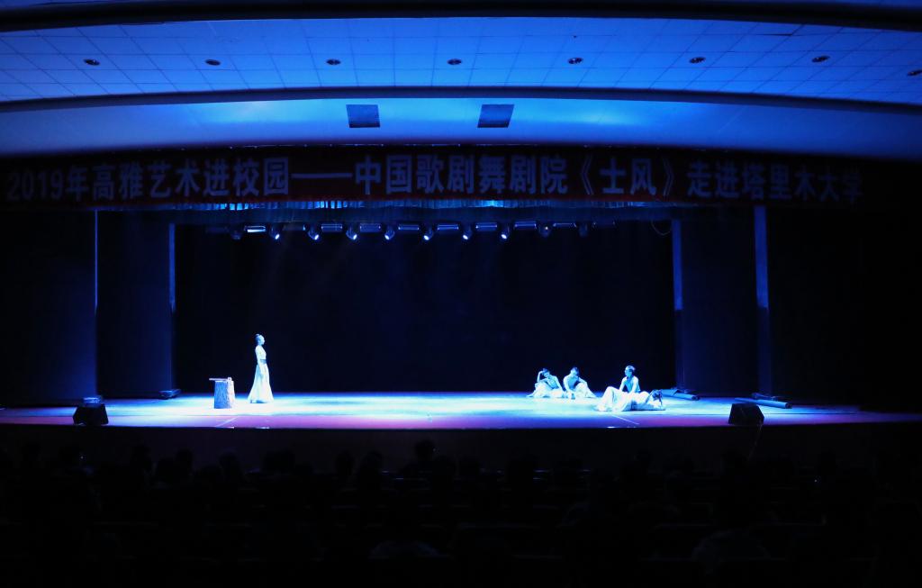 在学校深入开展“不忘初心、牢记使命”主题教育之际,11月8日晚,高雅艺术进校园——中国歌剧舞剧院舞剧《士风》走进我校。兵团党委第三巡视组、塔里木大学领导,兵团党委第三巡视组成员,一师阿拉尔市相关部门领导,有关专家,学校各部门、各学院领导,以及师生代表1000余人观看。专场演出在行政楼报告厅举办。