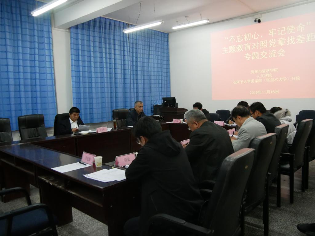 根据“不忘初心、牢记使命”主题教育安排,11月15日晚,历史与哲学学院、人文学院、石河子大学医学院(塔里木大学)分院在1号楼216会议室,召开对照党章党规找差距专题会议。党委书记赵光辉,学校第三指导组组长阿不都卡迪尔·艾海提,三个学院党委(党总支)领导班子成员、党支部书记,主题教育办公室成员参会。史哲院党总支书记、院长万朝林主持会议。