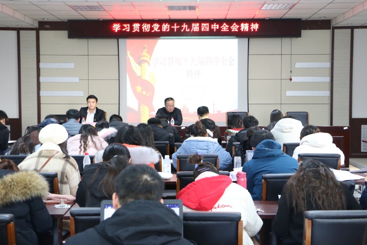 11月30日,我校研究生在农工楼401学习党的十九届四中全会精神。党委研究生工作部部长高庆华领学了党的十九届四中全会精神。研究生会干部、研究生党员、博士、研究生各班班委等150人参加。会议由研究生辅导员栗文主持。