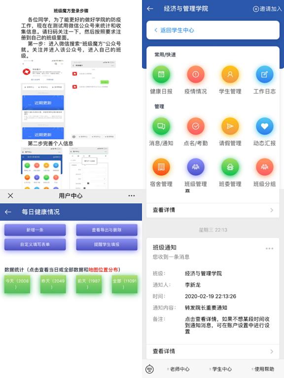 为了更加高效的落实落细疫情防控各项措施,杜绝数据信息反复填报等问题,经管院大胆创新,通过“金数据”“班级魔方”等网络工作平台,及时、准确、高效完成各类通知、信息收集、网上签到等工作。每天,学院通过这些平台,可以在2个小时内完成两千余名学生的健康信息填报工作。辅导员们通过最高效的方式,实现了“全覆盖、点对点、无遗漏”的工作目标。
