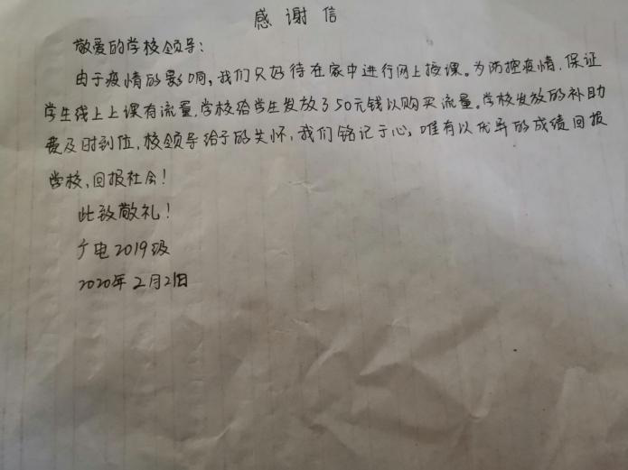 广电2019级薛伊俐说:“由于疫情的影响,我们只好呆在家里进行网上学习,为防控疫情,保证学生线上上课有流量,学校给学生发放了50元补贴购买流量,学校发放的补贴及时到位。校领导给予的关怀,我们铭记于心,唯有以优异的成绩回报学校,回报社会!”