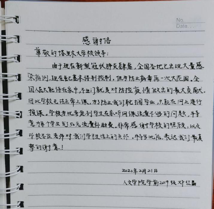 动医21-1班蔺玉刚说:“今年是一个不同以往的一年,整个新年,我们都在疫情的阴霾下快乐不起来。因为疫情影响,大家都隔离在家,去不了学校。现在全国开始实行停课不停学、但并不是每位同学家都有wifi有网线,这时学校又给我们流量补助。我很开心塔大为我们在这疫情寒冷中带来的一缕阳光,温暖了我们的心灵。“封城”“封路”“封村”却封不住的是学校的温暖真情。学校不光在精神上给予我们安慰,还在物质上给予我们帮助。作为新时代有作为的塔大戍边人,我们一定不忘塔大办学初心,扎根边疆,奉献一生。