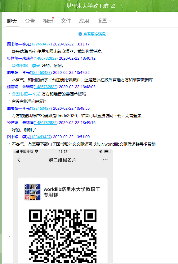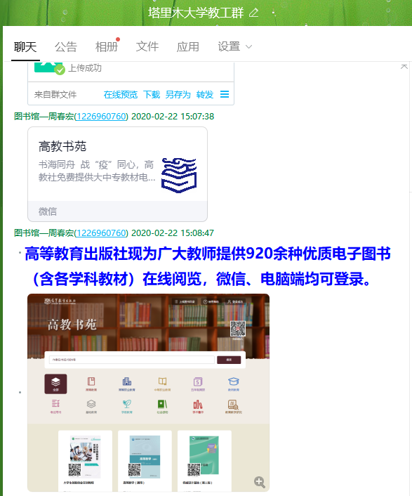 为了方便师生在家备课、查询资料、图书馆转变服务方式,做到闭馆不闭网,强化线上服务,为师生提供文献信息服务。图书馆信息咨询部主动与各数据库商联系,确保疫情期间数据库正常使用服务,并为不在校师生开通维普、万方、知网研学平台等学术资源。通过“塔里木大学教师”QQ群、“塔里木大学科研文献”微信服务群等,持续引导师生们在线使用图书馆数字资源和文献,保障师生对文献信息的需求。采访编目部积极联系高等教育出版社、清华大学出版社、机械工业出版社等教材出版机构,为教师开通“文泉学堂”、“高教书苑”等电子教材使用权限,有效解决教师备课教材和参考书籍不足的困难。