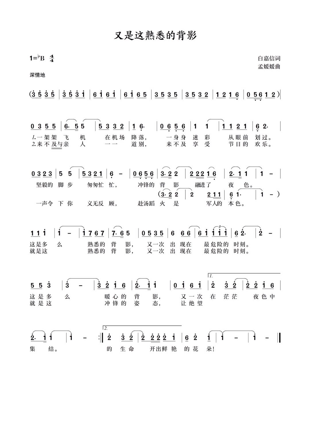 “一架架飞机在机场降落,一身身迷彩从眼前划过。坚毅的脚步匆匆忙忙,冲锋的背影融进了夜色。这是多么熟悉的背影,又一次出现在最危险的时刻。这是多么暖心的背影,又一次在茫茫夜色中集结,就是这熟悉的背影,又一次出现在最危险的时刻。就是这冲锋的姿态,让绝望的生命开出鲜艳的花朵。”这一句句温暖且充满力量的歌词,出自我校艺术与教育系教师孟媛媛老师与新疆音乐文学学会秘书长白嘉信老师共同创作的《又是这熟悉的背影》。