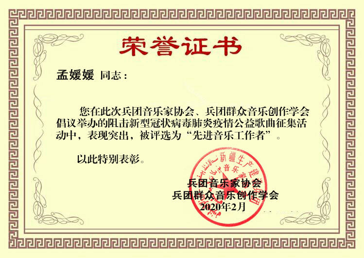 孟媛媛先后创作的战疫歌曲《再唱春风一曲弦》、《又是这熟悉的背影》,分别在兵团音协关于狙击新冠肺炎疫情公益优秀歌曲第三期、第七期、第三十一期展播。孟媛媛本人被兵团音乐家协会评为“先进音乐工作者”。她用歌声表达了对一线医务人员的崇高敬意,也通过歌曲向大家传递了力量。