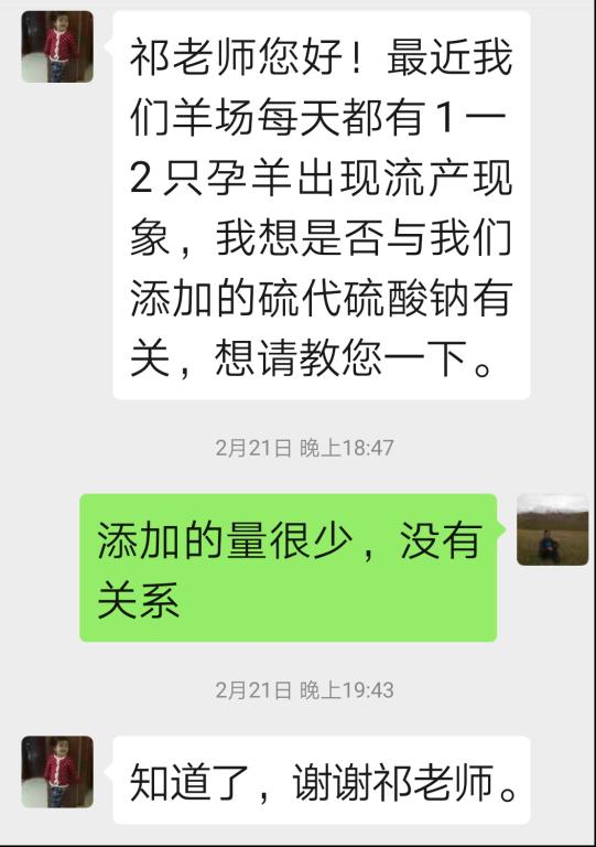 “祁老师您好!最近我们羊场每天都有1-2只孕羊出现流产现象,我想是否与我们添加的硫代硫酸钠有关,想请教您一下。”2月21日晚,塔里木大学动物科学学院祁成年教授收到墨玉县喀尔赛乡的一个扶贫羊场技术人员的微信。