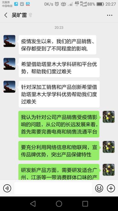 新疆叶河源果业公司吴旷雷说:“疫情发生以来,我们的产品销售、保存都受到了不同程度的影响,希望借助塔里木大学科研和平台优势,帮助我们度过难关,针对深加工销售和产品创新希望借助塔里木大学学科优势帮助我们度过难关。”