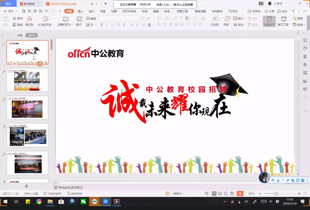3月29日上午,历史与哲学学院携手北京中公教育科技有限公司乌鲁木齐分公司,利用腾讯直播平台为2020届毕业生举办“诚载未来 耀你现在”线上招聘会。中公教育科技有限公司乌鲁木齐分公司人力资源招聘讲师吕勇璋主持,参与毕业生26人,提供就业岗位20余个。