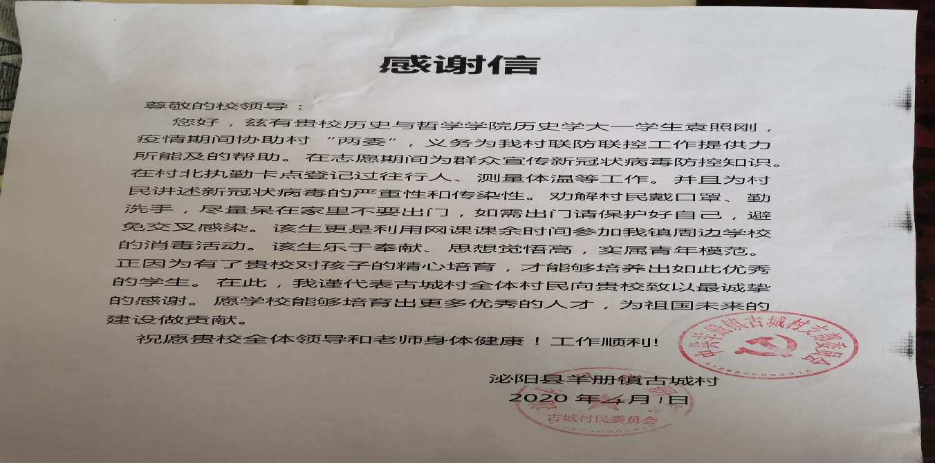 历史学2019级2班班主任王志刚说:“作为一名很早就积极参与到疫情防控阻击战中的共青团员,袁照刚同学做出了很大的努力,踏实能干、吃苦耐劳,坚守防疫卡点,用自己的实际行动保护和守卫着村民们的安全,这一点值得我们所有学生学习。文/李尧利 袁照刚 摄/袁照刚