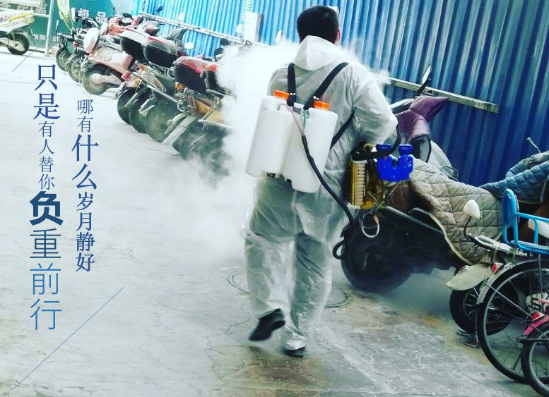 天空变幻无常,下午时刻,灰蒙蒙的天空,迟迟不见阳光。不久,一个身影出现在我的视野中,社区工作人员背着沉重的消毒器材开始了一天的消毒工作,这本是他们平常工作中的一项罢了,但不知为何,他的身影仿佛有着某种特殊的意味,就像太阳的一束强光,穿过厚厚的云层,将温暖与希望撒向大地,驱散了一切阴霾,这个身影让我心安。咔嚓一下,我决定将这个身影永远记录下来,让那些心旌摇曳的人们能够看到,我们的身边有多少同胞在为这场战疫奋斗着,我们并不是独身一人,而是有这些千千万万的身影挡在了我们身前,我们是幸福的,我们的家是温暖的。