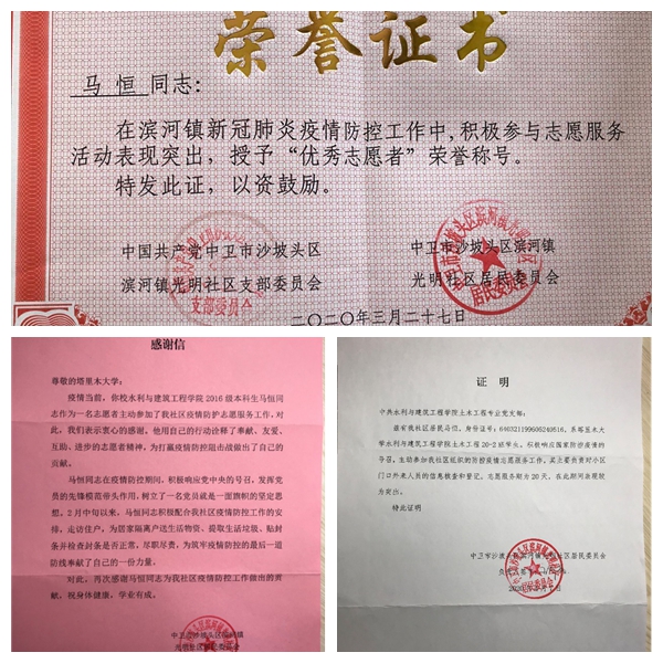 马恒同志系土木工程专业党支部一名党员,也是土木工程20-2班班长。在疫情防控期间,积极响应党中央的号召,发挥党员的先锋模范带头作用,树立了一名党员就是一面旗帜的坚定思想。2月中旬以来,马恒冋志积极配合该地区疫情防控工作的安排,走访住户,为居家隔离户送生活物资、提取生活垃圾、贴封条并检査封条是否正常,尽职尽责,为筑牢疫情防控的最后一道防线奉献了自己的一份力量。马恒同志被中卫市沙坡头区滨河镇光明社区和社区党支部授予“优秀志愿者”称号。
