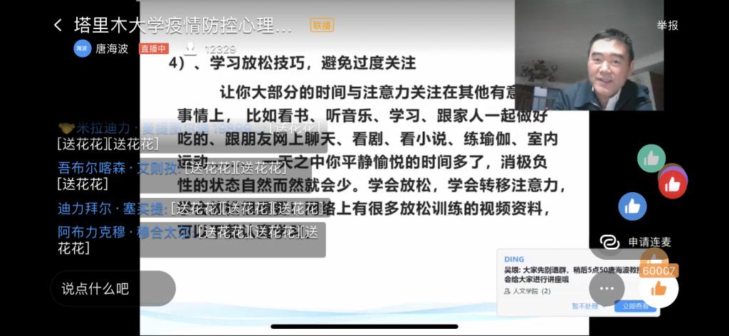 为引导我校师生做好个人防护,积极调整心态,适应云端生活,提高身心免疫力,打好疫情防控“心理战”,4月8日,中南大学唐海波教授应邀为全校师生开展了题为《大学生新冠疫情防控及心理调适方法》的线上心理健康讲座,深受师生们的喜爱,共吸引了12627名师生线上学习,点赞86873人次。