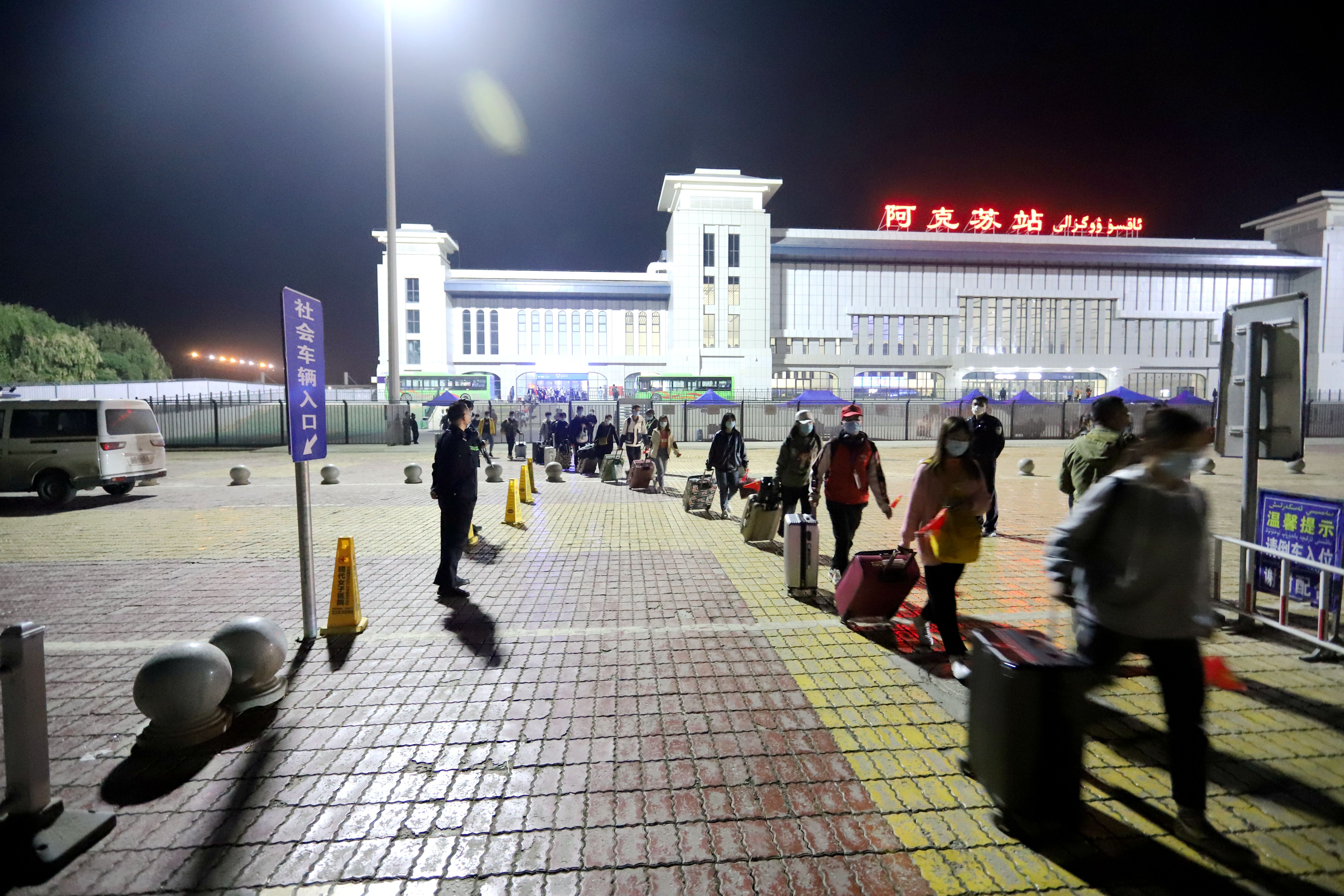同学们排队登上大巴车,离开阿克苏火车站,前往阿拉尔市,27辆大巴专运、10辆警车60多名警察全程护航。
